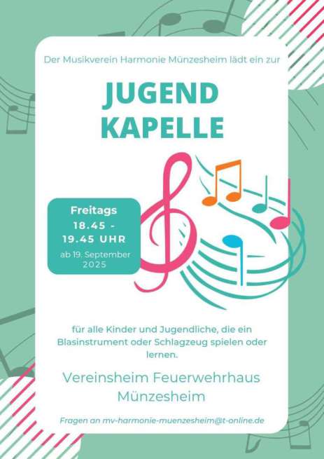 Seit dem 19. September gibt es in Münzesheim darüber hinaus auch endlich wieder eine Jugendkapelle. Alle Kinder und Jugendliche, die ein Blasinstrument oder Schlagzeug lernen und gerne in einem Orchester gemeinsam musizieren möchten, sind herzlich eingeladen, freitags von 18.45 bis 19.45 ins Vereinsheim beim Feuerwehrhaus am Horst-Kochendörfer-Platz zu kommen. Ab 20 Uhr sind auch bei den „Großen“ Neu- oder Wiedereinsteiger herzlich willkommen.